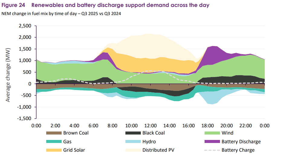 Battery discharge increased by 463MW year-over-year during evening peak hours between 1,600 and 2,000, representing a 177% growth that addressed grid stability requirements.