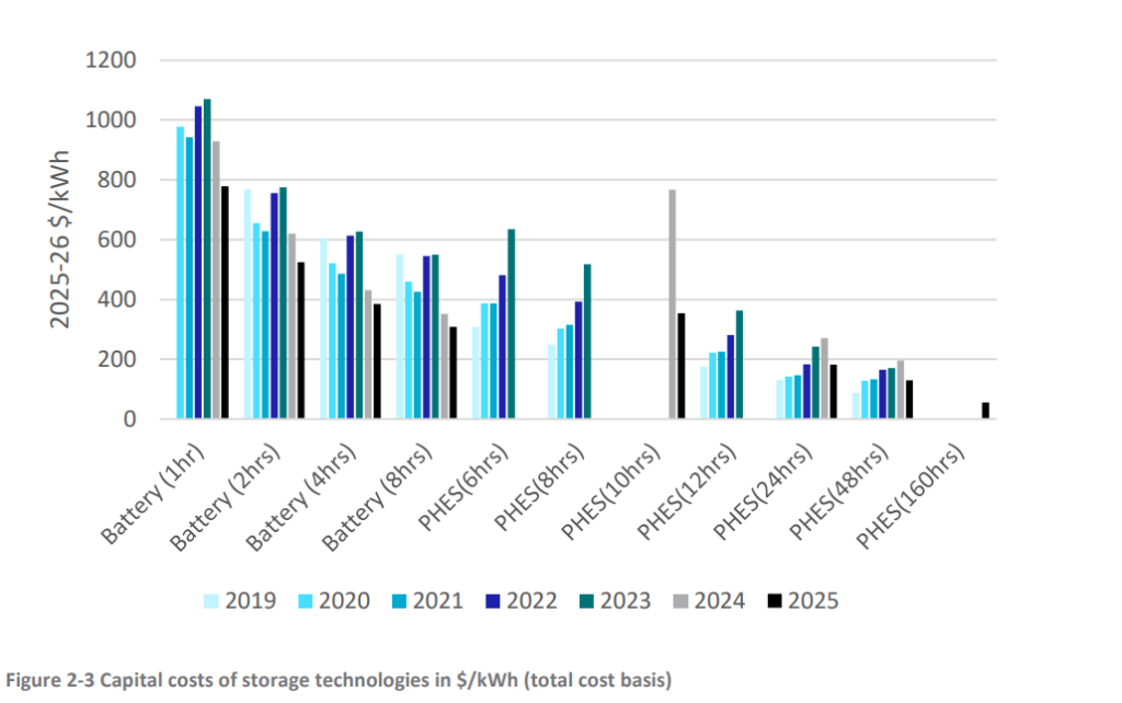 Battery storage costs fall across all durations, while pumped hydro sees major reassessment