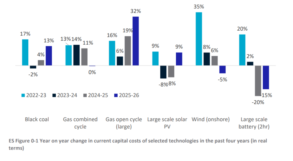 This stands in stark contrast to fossil fuel technologies, with large gas open-cycle plants experiencing a 32% cost increase and black coal plants rising by 13% over the same period.