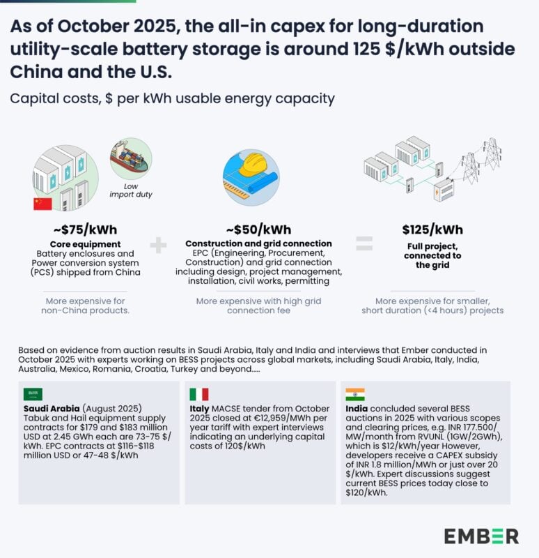 Also, last week (11 December), climate solutions think tank Ember released new analysis assessing the all-inclusive BESS capex required for a 4-hour+ duration project across all global markets, excluding China and the US, to be at an average of US$125/kWh as of October 2025.