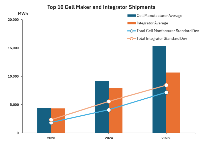The standard deviation, and therefore spread, of shipments from all integrators has been consistently higher than for cell manufacturers. However, for both groups, the disparity between the top players and the rest has been widening as market leaders solidify their place at the top.