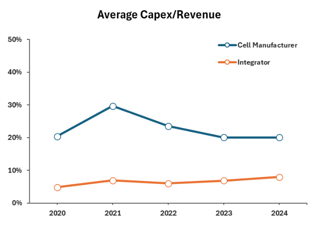The majority of energy storage cell manufacturers also produce cells for EVs, another very competitive market, and some companies may have been heavily investing early to increase production capacity in a bid to gain market share. For example, CALB’s capex exceeded its revenue from 2020-2023.