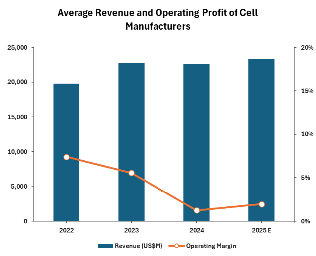 Operating margins of cell manufacturers generally follow overall cell prices. Since 2022, the decline in lithium prices and oversupply have pushed cell prices even lower, which in turn could benefit energy storage integrators.