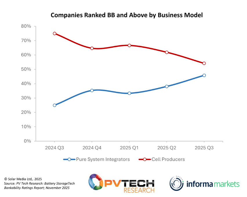 When examining all companies rated BB and above, the first release of the report indicated that almost 80% of the companies were involved in some form of cell production. In contrast, the most recent release, in Q3 2025, shows that this figure is just above 50%. Part of this change can be attributed to the shift in methodology. However, even prior to this change, there was a noticeable trend; for example, in Q2 2025, the percentage was just over 60%.