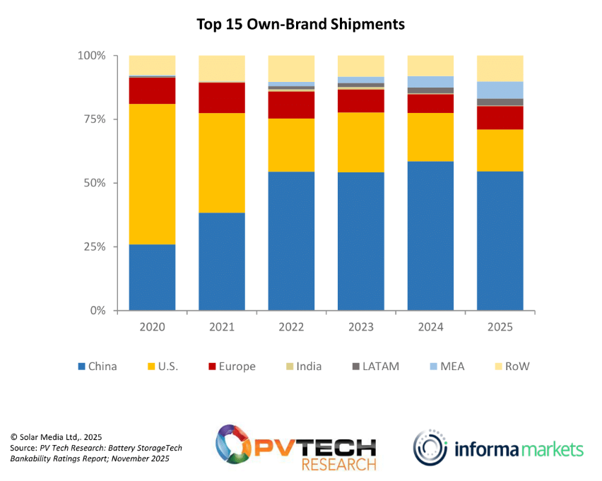 Figure 3: China’s market share remains the dominant destination for shipments from the top 15 ESS suppliers, but an increasing share is being shipped to regions such as MEA, LATAM and Australia.