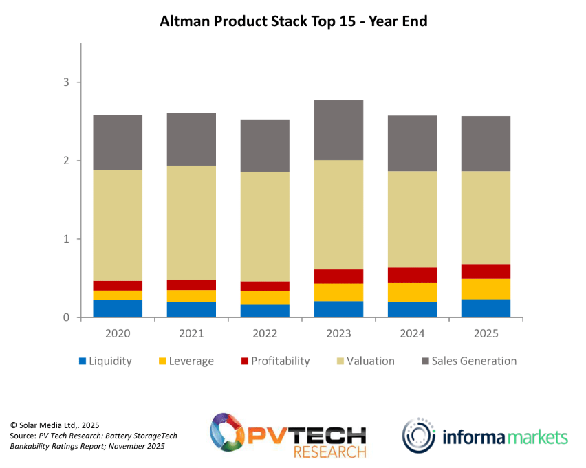 The Altman-Z score is divided into parts, allowing for a clear evaluation of the three key metrics that contribute to a company’s financial health: Liquidity, Leverage and Profitability. The Liquidity and Leverage metrics are trending upwards, increasing over the last three years in the sample, and profitability is staying around the same level. Especially for the cell manufacturers, this could be due to the larger investment in R&D, with many larger capacity cells being announced recently. These metrics consistently staying positive and rising is an excellent sign for the industry.