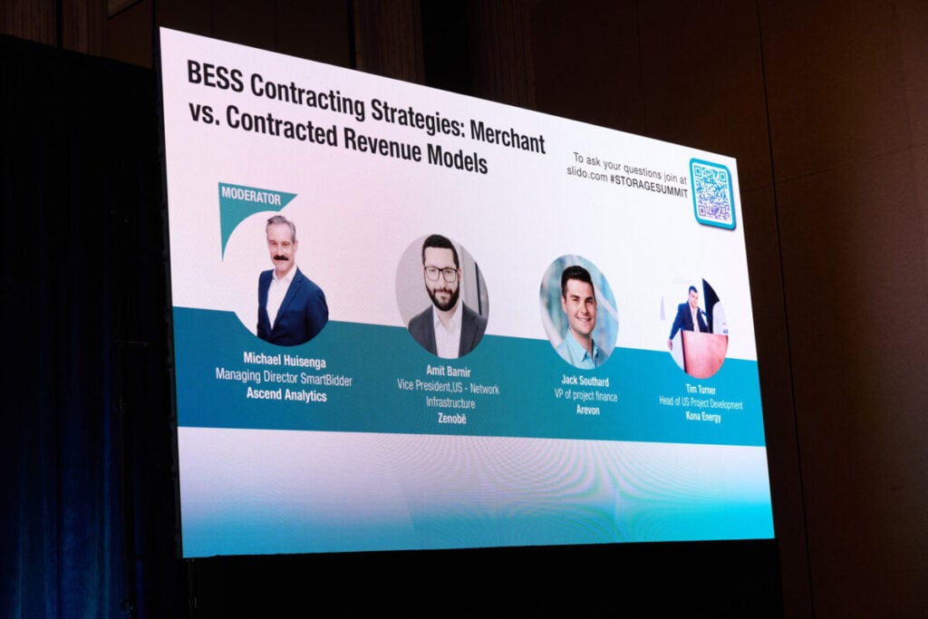 The panel discussion, titled “BESS Contracting Strategies: Merchant vs. Contracted Revenue Models”, was moderated by Michael Huisenga, Managing Director SmartBidder at Ascend Analytics, Tim Turner, Head of US Project Development at Kona Energy, Jack Southard, VP of Project Finance at Arevon, and Amit Barnir, Vice President, US Network Infrastructure at Zenobē Energy.