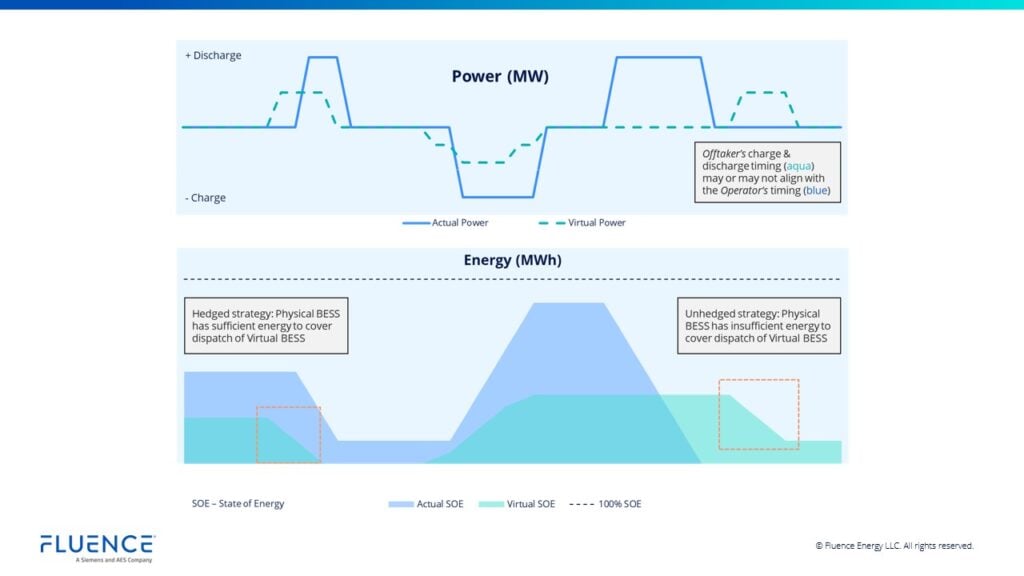 Unlike physical tolls, virtual battery tolls can be sold for just a portion of the physical BESS. For example, an operator might contract 50% of the capacity of the BESS to an offtaker and retain the rest to trade as merchant, balancing a fixed revenue stream with market exposure.